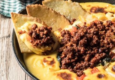 6 oz of our Easy Cheesy Queso with your choice or Barbacoa, ground beef/Impossible ground beef or Pork Chorizo, served with low carb tortilla chips and jalapenos (5 g of carbs per serving)